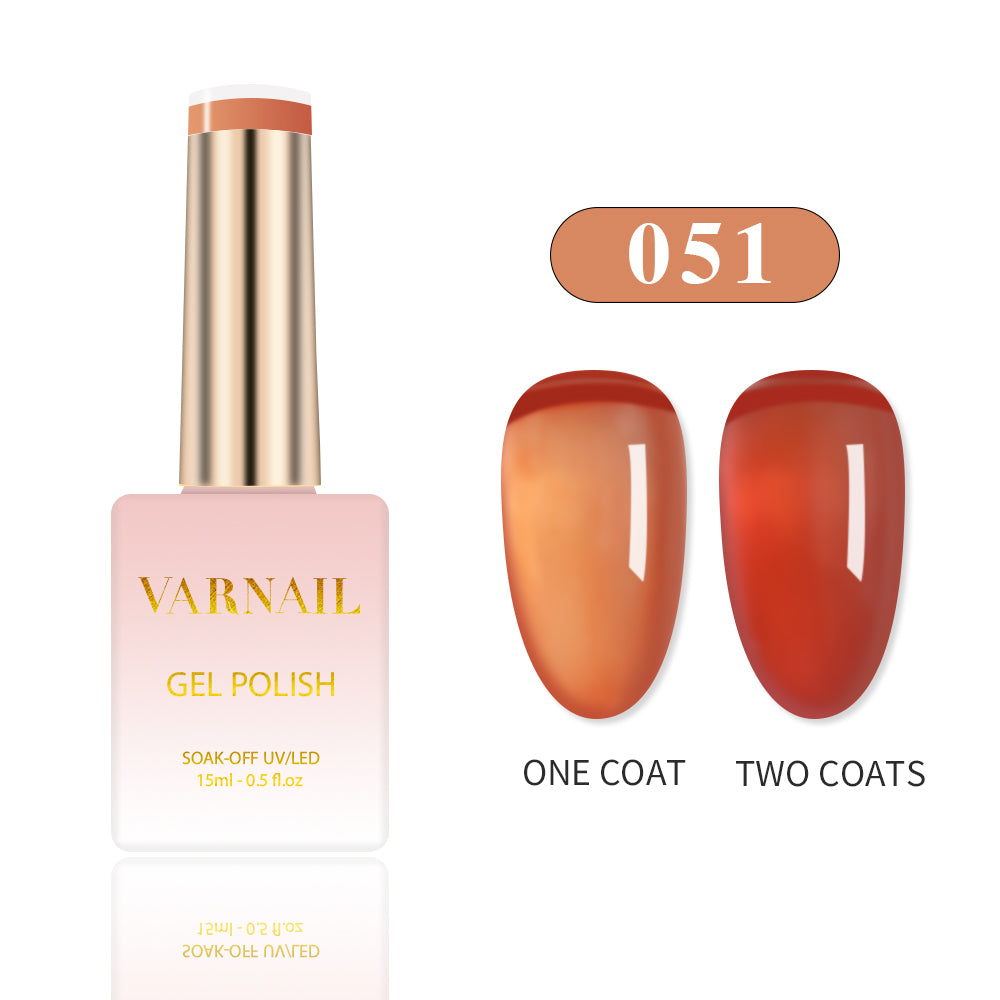 Our jelly syrup gel polish with perfect self-leveling feature, assures long lasting wear, smooth covergae and high-gloss shine. These translucent soak-off gel polish can be applied as a one, two or three coats, which bring more possibilities of nail look. One coat will give your nail a natural tint look, while adding more coats will