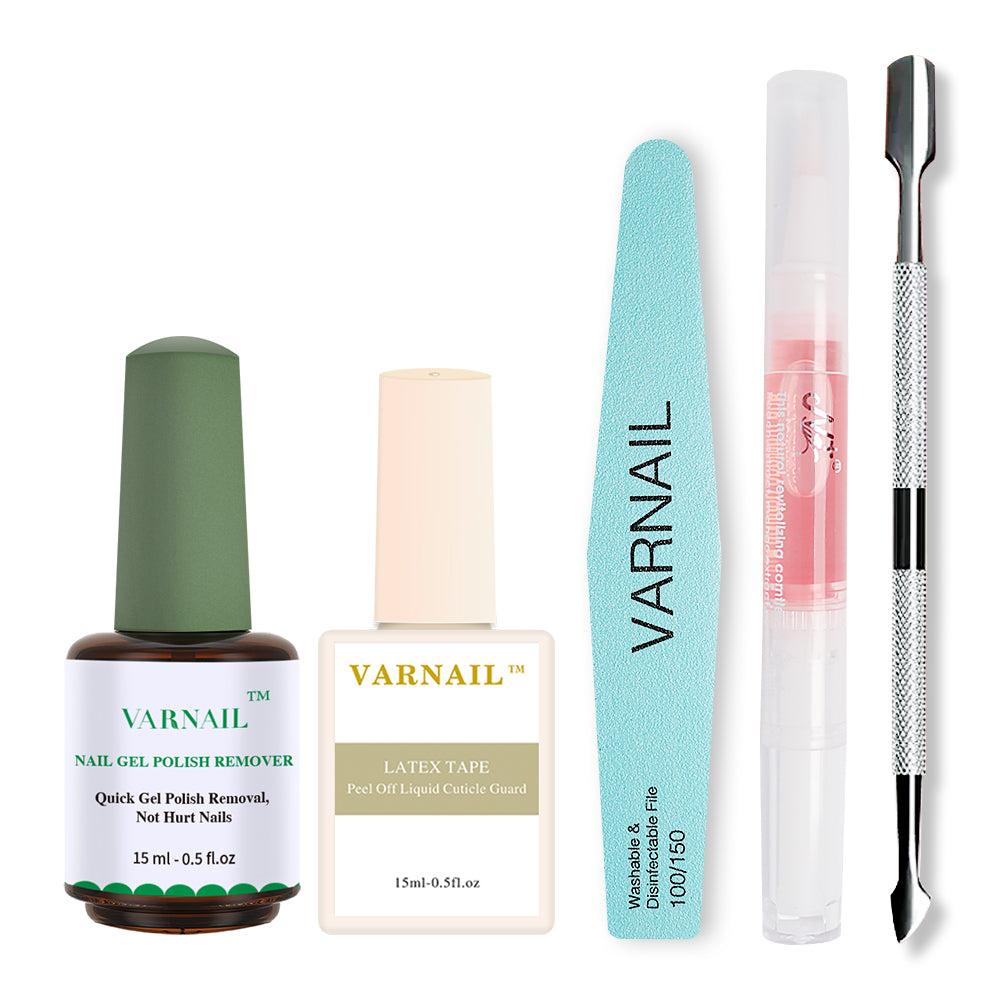 4. Remove the residual nail polish gently with a small steel pusher. And finailly peel off the protective nail latex tape.