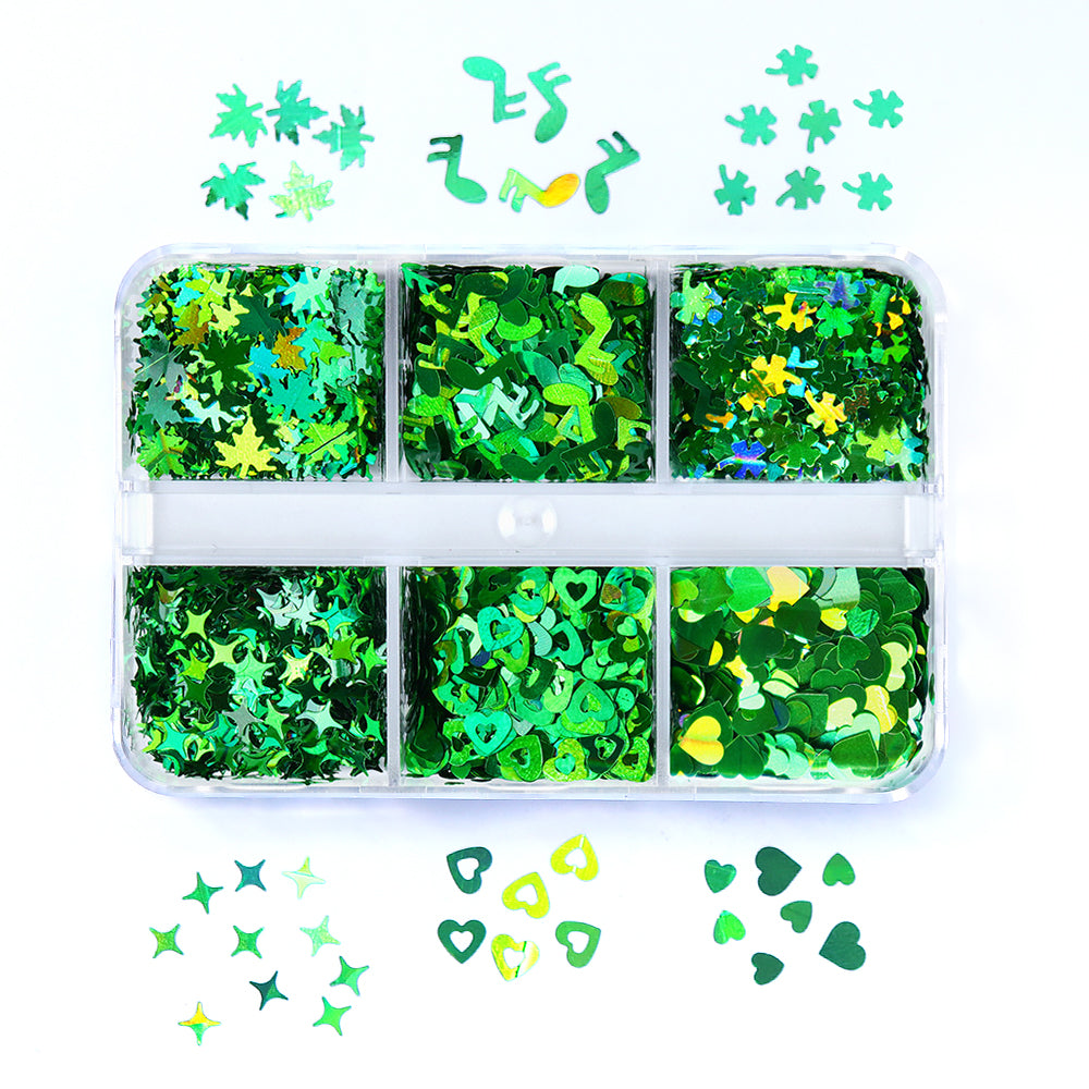 Mix Green Nail Glitters (Contain hearts, Music Note,Star...) 6 Grids Four-leaf Clover Nail Glitters for St.Patrick's Day