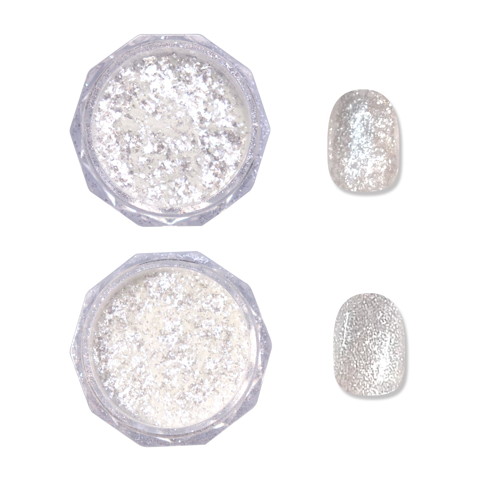 These silver glitter nail art foil flakes are incredibly sparkly. Perfect for creating shimmering snow flake nail designs in winter, or for a festive look with a dazzling silver and white glitter gradient nail design. They are very thin, adhere well to the nail surface, and are easy to apply.