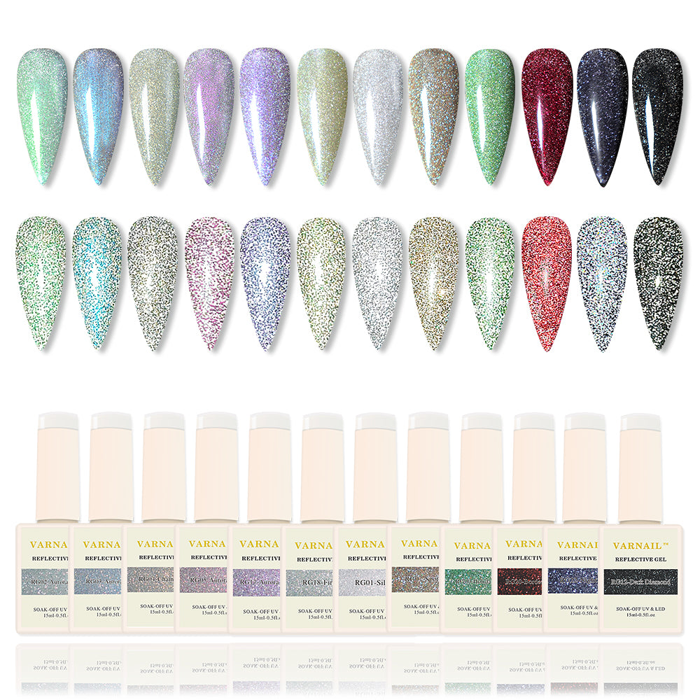 15 x Reflective Gel (RG01-Silver, RG02-Aurora Green, RG03-Aurora Blue, RG04-Champagne, RG05-Aurora Pink, RG07 Spotlight, RG09 Holiday Vibe, RG12 Dark Diamond, RG17-Aurora Purple, RG18-Firefly, RG20 Bordeaux Red, RG22 Night Sky)